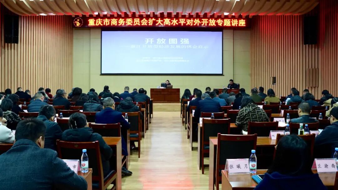 12月10日,市商务委举行扩大高水平对外开放专题讲座,浙江省人民政府特约研究员,原商务厅副厅长、自贸办副主任张钱江应邀作专题辅导。市商务委党组书记、主任章勇武主持讲座并讲话,在家班子成员、直属单位领导、机关全体干部职工,共计200余人参加。