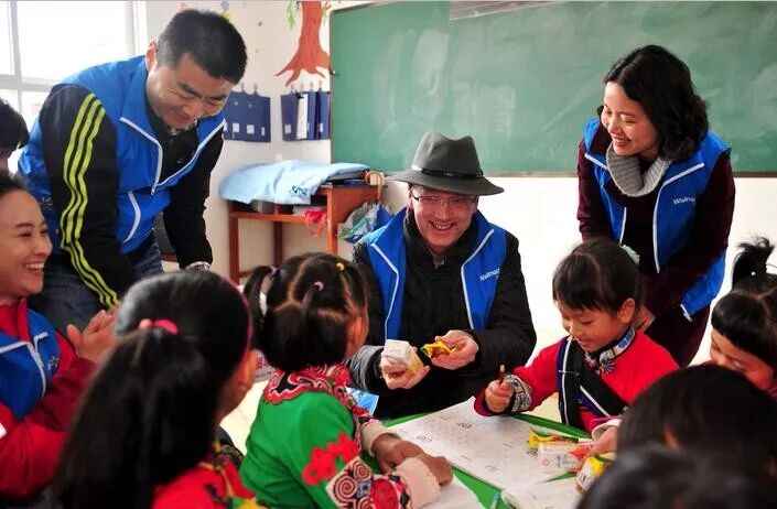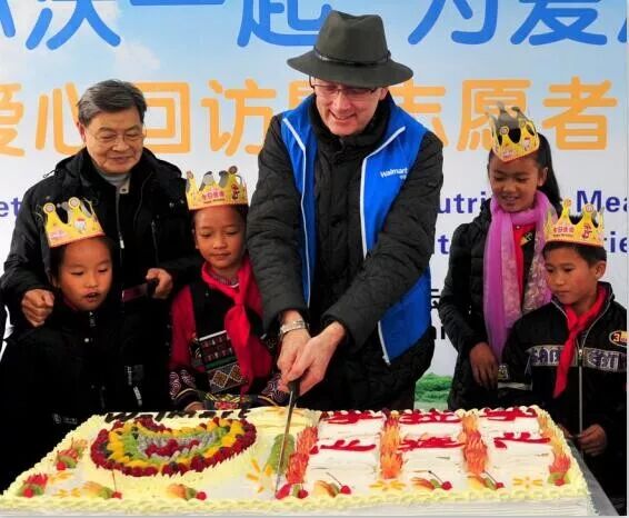 照片说明: 沃尔玛全球执行副总裁、沃尔玛加拿大及亚洲区首席执行官岳明德和志愿者为云南贫困地区孩子庆祝生日。