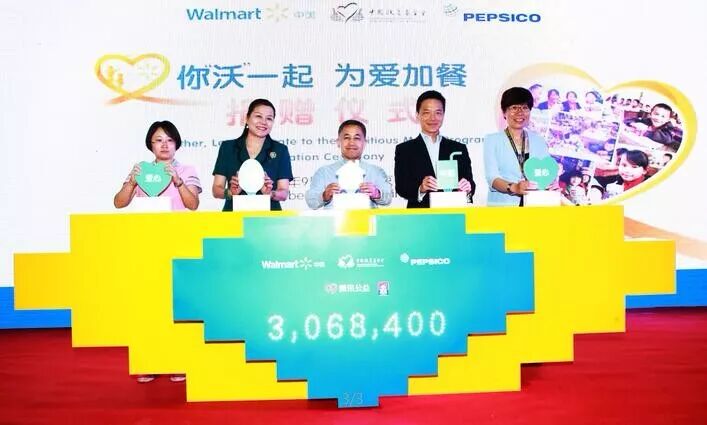 照片说明: 沃尔玛中国扶贫基金会顾客代表和供应商共同宣布2017年爱加餐募款306万元。